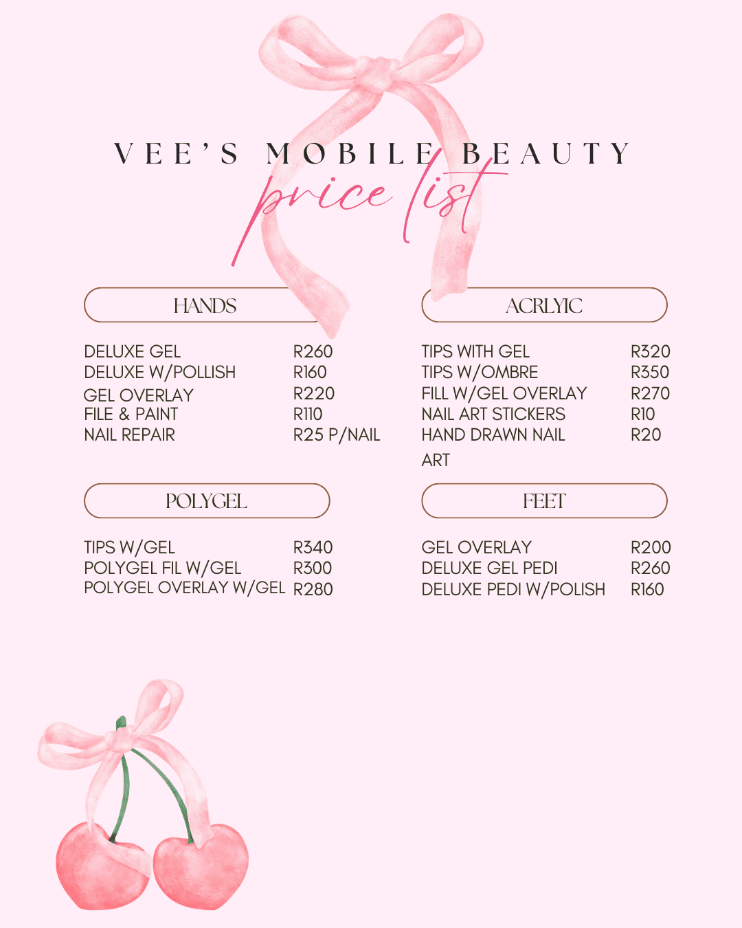 At Vee’s Mobile Beauty, we believe self-care should be simple, convenient, and oh-so-pretty. Whether it’s nails, lashes, or waxing, we bring the salon experience right to your door-so you can relax, sip your coffee, and let us handle the glam.
